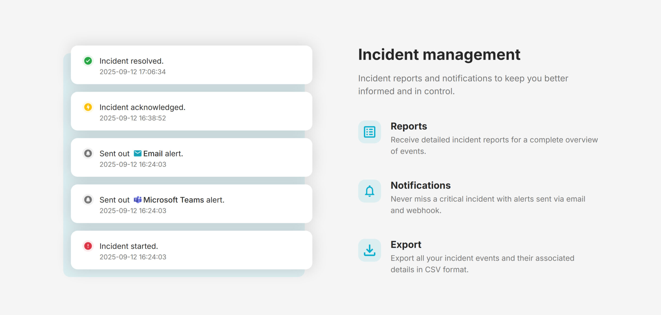 When an incident occurs, clarity is everything. This section is designed to show the product's power in a real-world scenario. On the left, a live-feed UI shows the entire incident lifecycle—from "Incident started" to "Resolved." On the right, a simple, icon-based list explains the core features: Reports, Notifications, and Export. This parallel layout clearly communicates both the process and the practical tools.