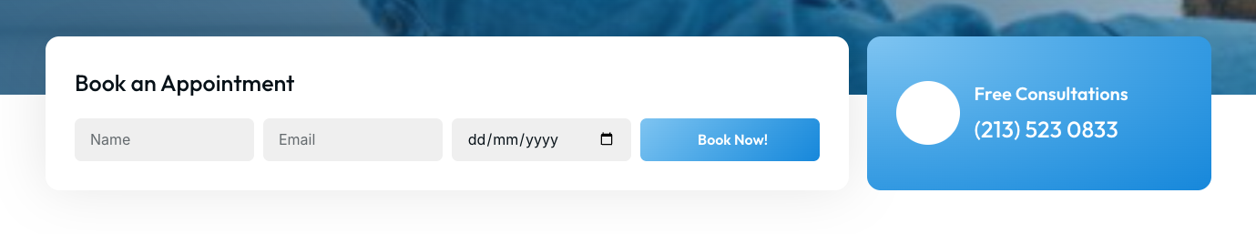 This high-impact section is designed to capture the lead. It's a powerful dual-CTA: The simple, 4-field "Book an Appointment" form is perfect for users who are ready to schedule. The high-contrast, high-visibility "Free Consultations" box with a clear phone number is designed for users who have an urgent need or prefer to call. This design ensures that no matter the user's preference, a clear and simple path to contact is always their last impression.
