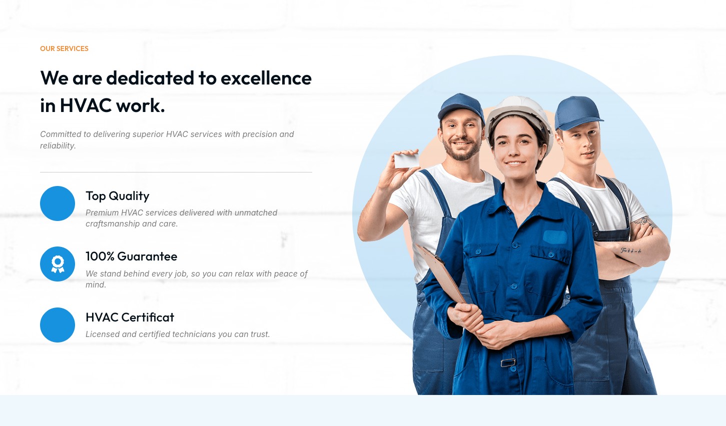For an in-home service, trust is everything. This section is engineered to build it instantly. Under the confident headline, "We are dedicated to excellence," we used a scannable, icon-based list to highlight the three key promises a customer looks for: "Top Quality," "100% Guarantee," and "HVAC Certificate." This, paired with the professional team photo, provides immediate, powerful reassurance.