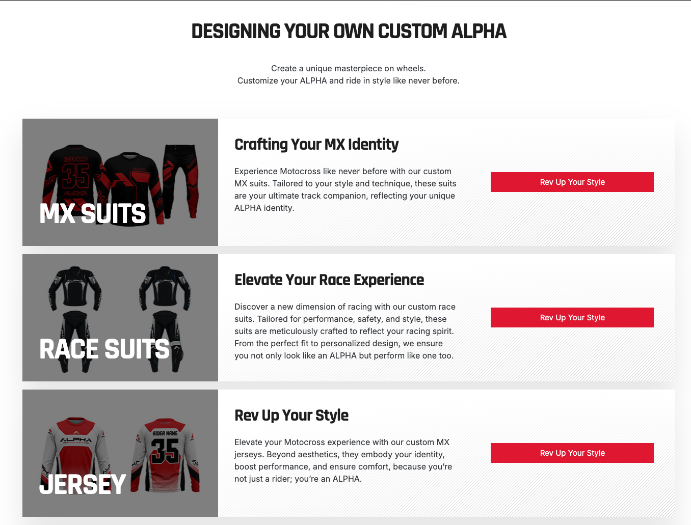 Racing isn't just a sport; it's an identity. This section is designed to put customization front and center. Under the powerful headline, "DESIGNING YOUR OWN CUSTOM ALPHA," we created a clean, product-focused layout for the main categories: "MX SUITS," "RACE SUITS," and "JERSEY." Each category is paired with a clear, direct "Rev Up Your Style" call-to-action, inviting riders to craft their unique on-track identity.
