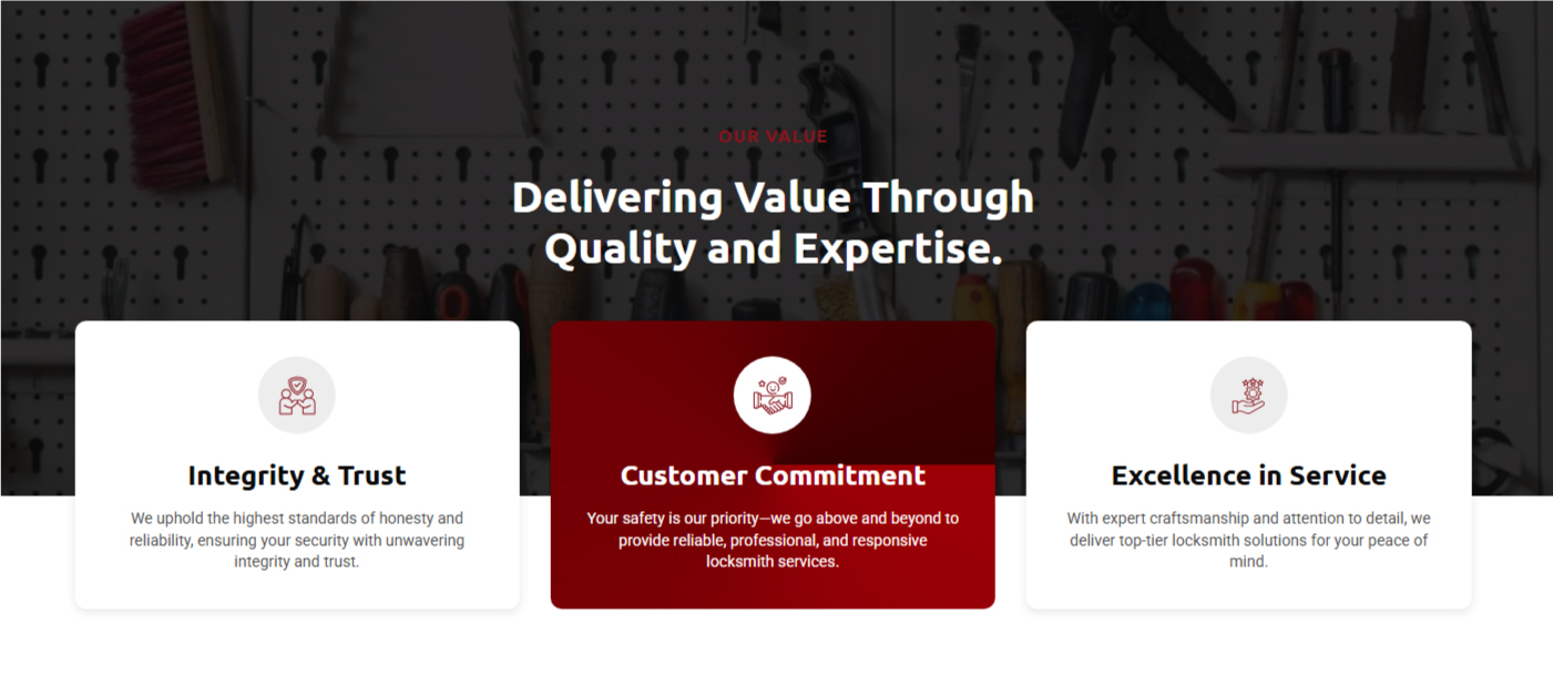 This section solidifies the brand's character. We used a clean, 3-card layout to clearly communicate their core values: Integrity, Commitment, and Excellence.
