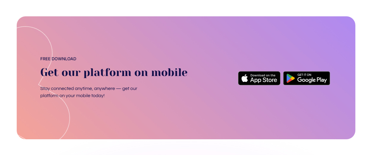 This section highlights the platform's full mobility. Under the clear headline, "Get our platform on mobile," we used a clean, eye-catching banner with soft gradients to drive downloads. The prominent and trusted "App Store" and "Google Play" badges serve as direct CTAs, reassuring users they can stay connected and manage their business from anywhere.
