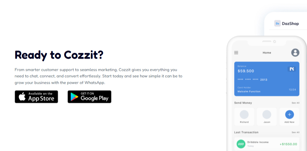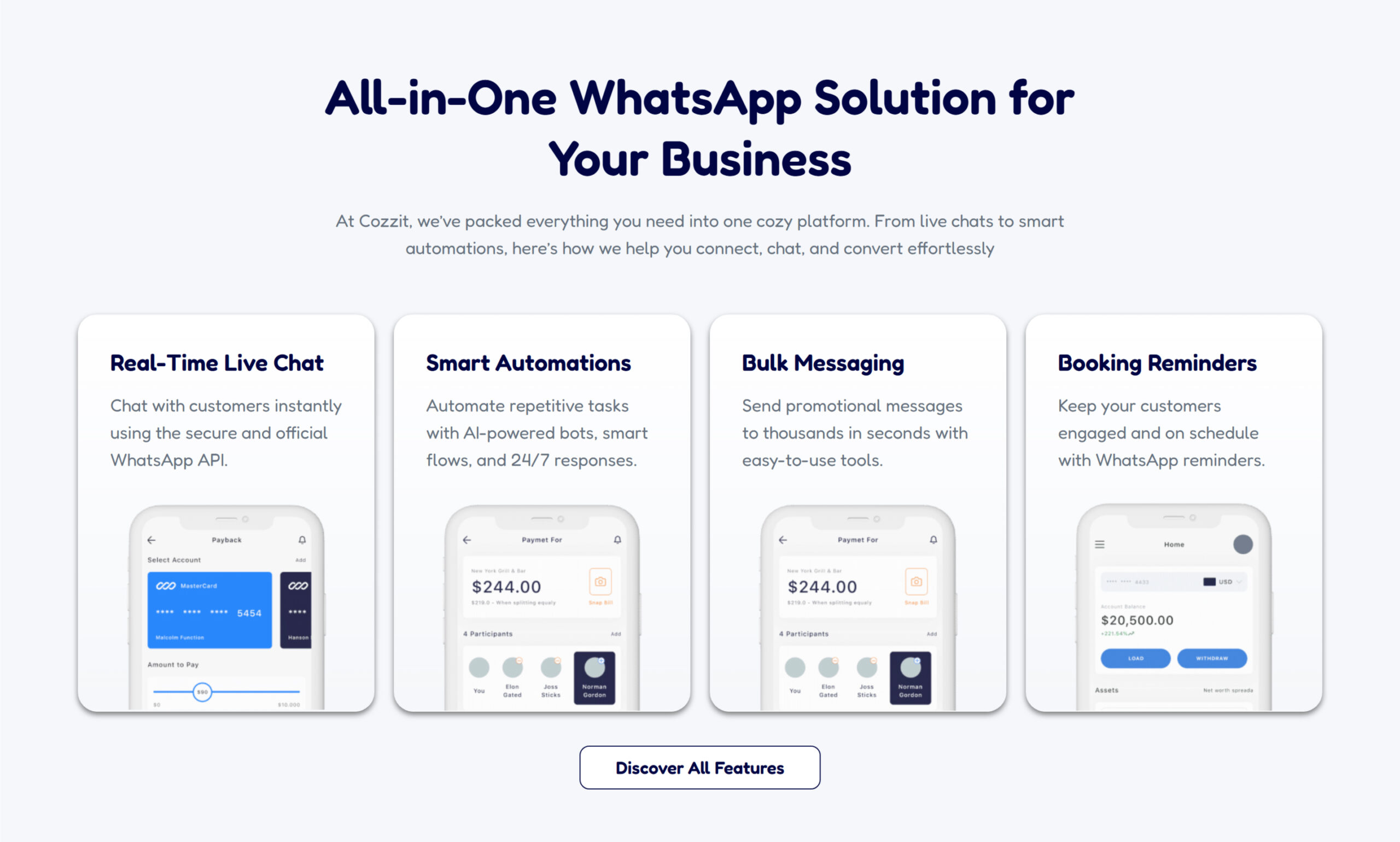 Here, we break down the product's core value. Under the clear headline, "All-in-One WhatsApp Solution," we designed a clean, 4-card grid to showcase the main features.