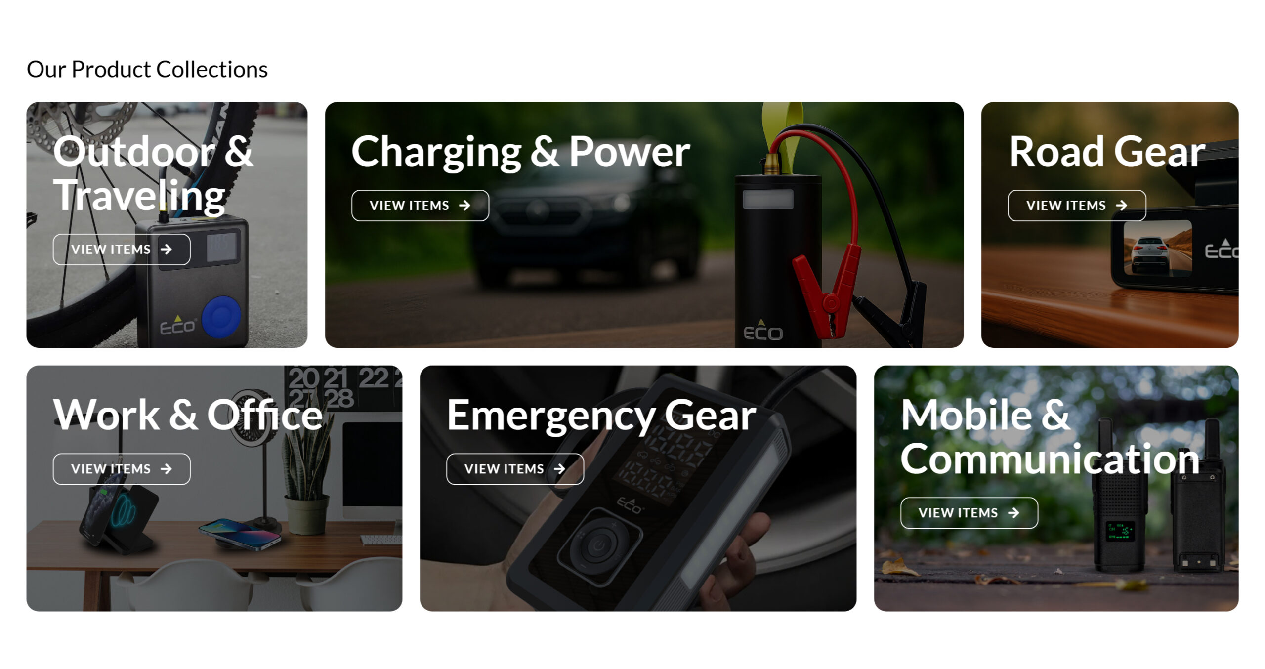 This section is the primary navigation engine for the shop. We designed a clean, 6-card grid to visually merchandise the "Our Product Collections." Each category from "Outdoor & Traveling" to "Road Gear" and "Emergency Gear" is presented with a high-quality lifestyle image.